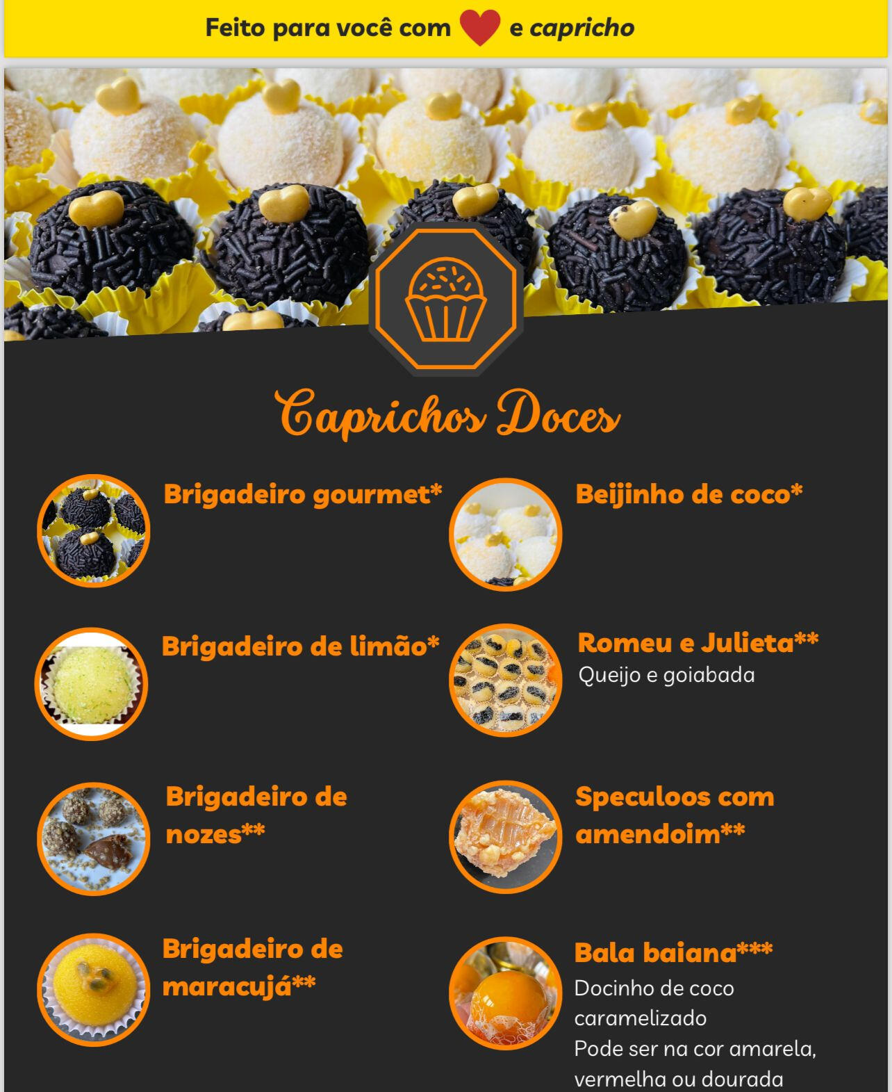 Brigadeiro gourmet, Brigadeiro de limão, Brigadeiro de nozes, Brigadeiro de maracujá, Beijinho de coco, Romeu e Julieta (queijo e goiabada), Speculoos (biscoito de canela) com amendoim, Bala baiana.